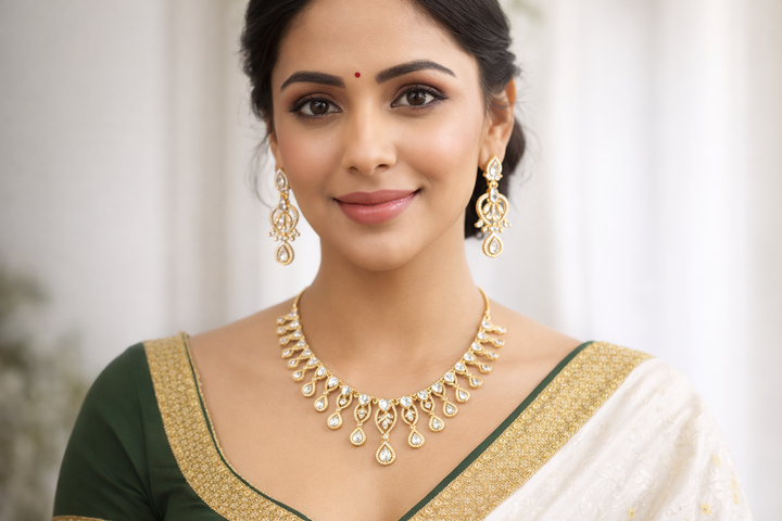 This elegant jewellery set is ideal for weddings, festive celebrations, cultural ceremonies, and traditional gatherings. Its detailed pendant and delicate pearl strands complement sarees, lehengas, and other ethnic outfits beautifully, making it a graceful accessory for special moments.